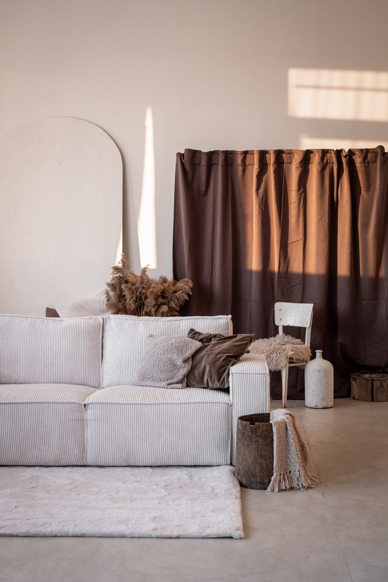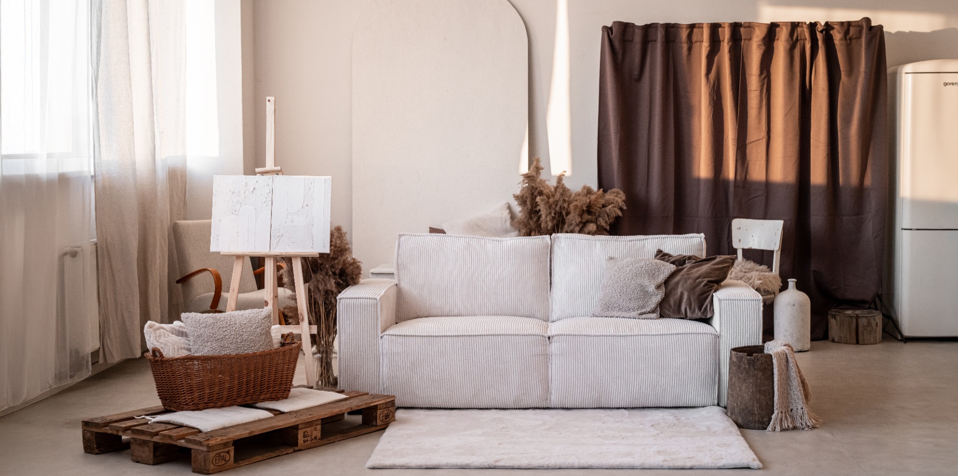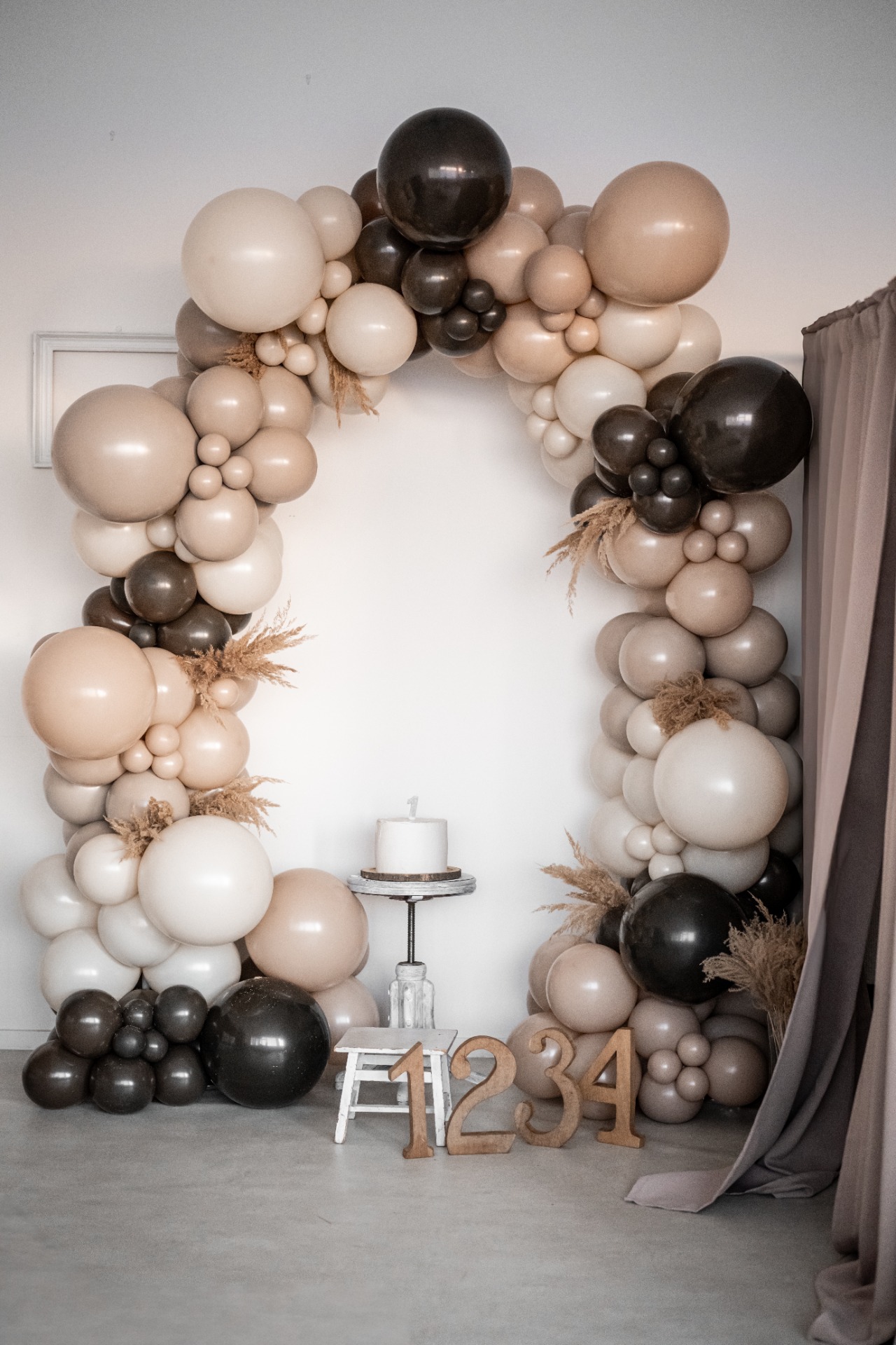 Rustikální ateliér je světlý, vzdušný a promyšlený prostor pro rodinné, portrétní i komerční focení. Aktuální aranžovaná scéna je laděná do jemných krémových a hnědých tónů, doplněná o manšestrovou bílou pohovku, hnědý závěs a balónkovou narozeninovou scénu.