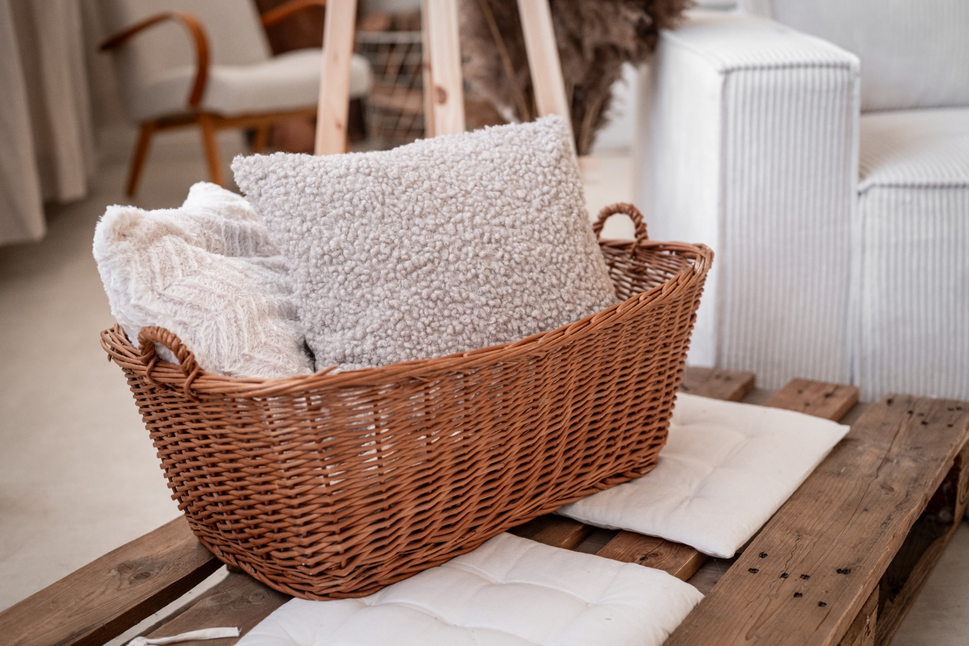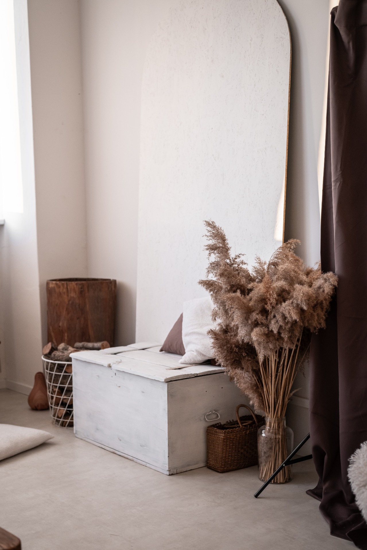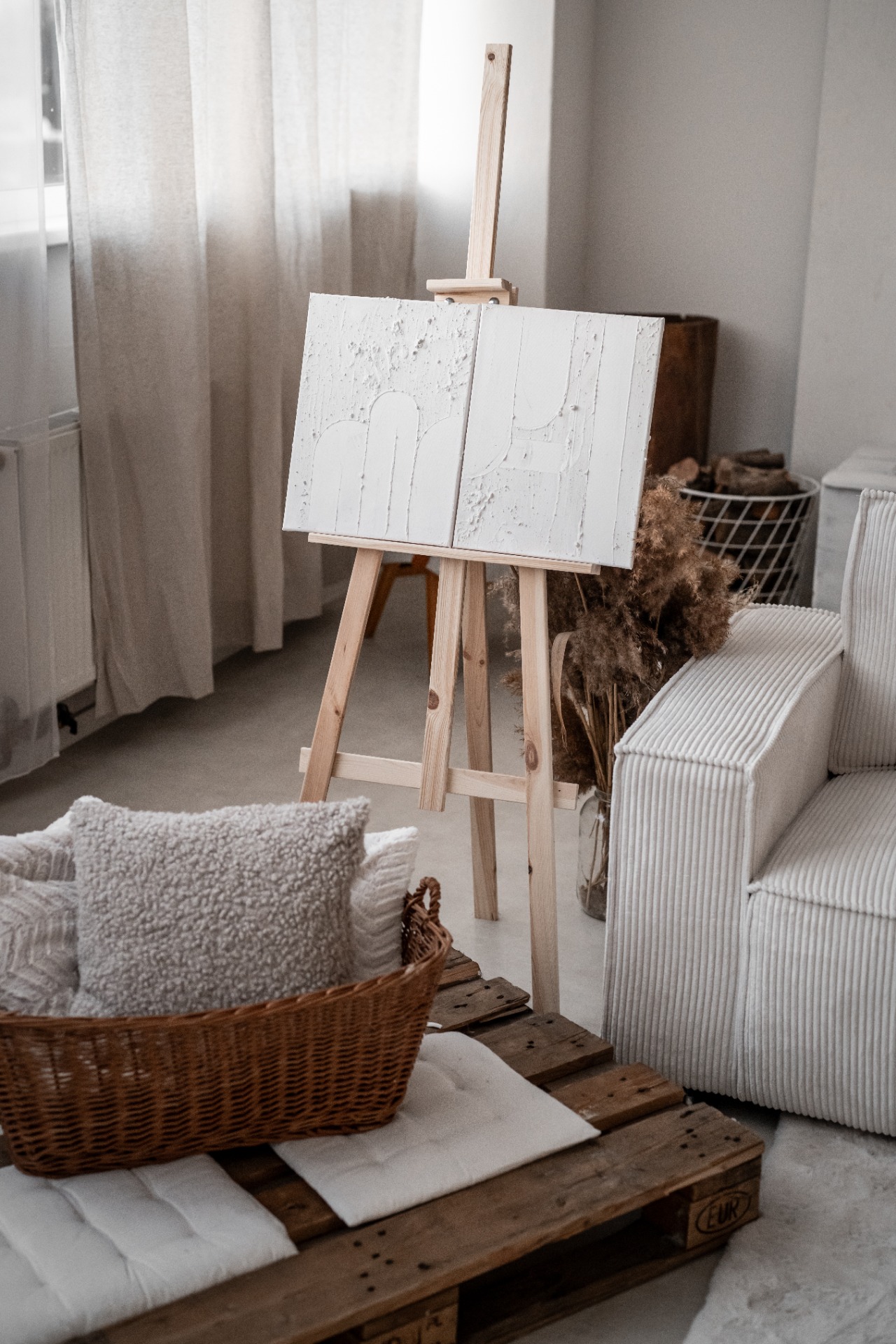 Rustikální ateliér je světlý, vzdušný a promyšlený prostor pro rodinné, portrétní i komerční focení. Aktuální aranžovaná scéna je laděná do jemných krémových a hnědých tónů, doplněná o manšestrovou bílou pohovku, hnědý závěs a balónkovou narozeninovou scénu.